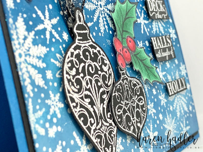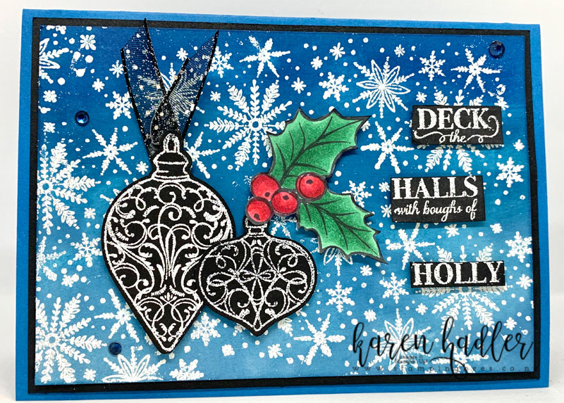I have used the snow Flakes from the Christmas Crowd stamp set and white embossed them on to Whisper White card stock before Brayering the blue background. This is called emboss resist a fun an exciting way to make you own background. I absolutely love creating my own backgrounds experimenting with different colours, and not always the traditional colours either 🙂 I finished the card with the Ornaments from Christmas Gleaming. I hope you enjoy ,