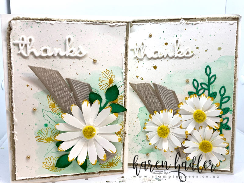 I love the Daisy Lane and Daisy Delight Stamp sets and co-ordinating punches they are so versatile, I have made these cards with fresh white Daisy’s, it certainly reminds me of spring 🙂