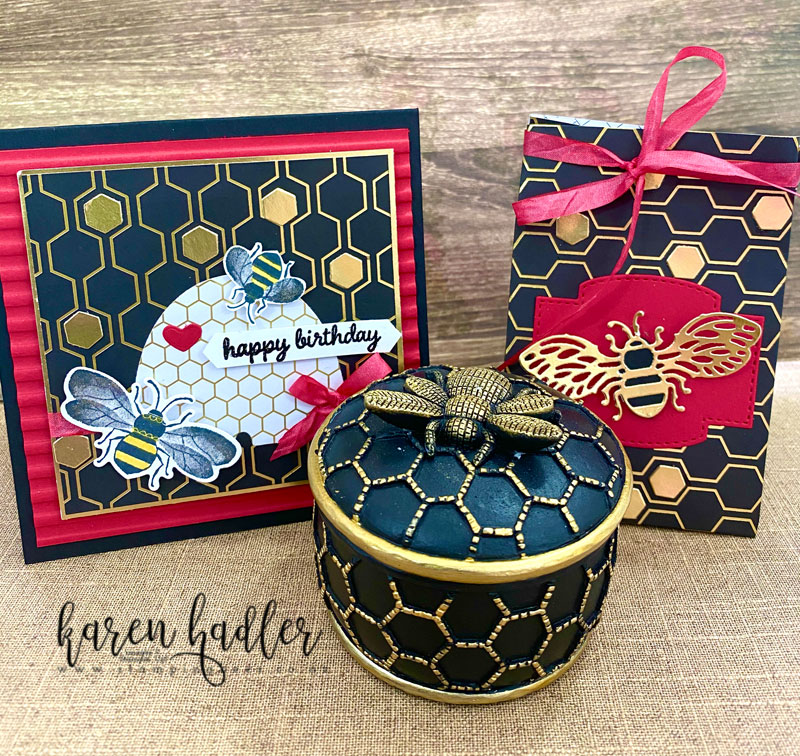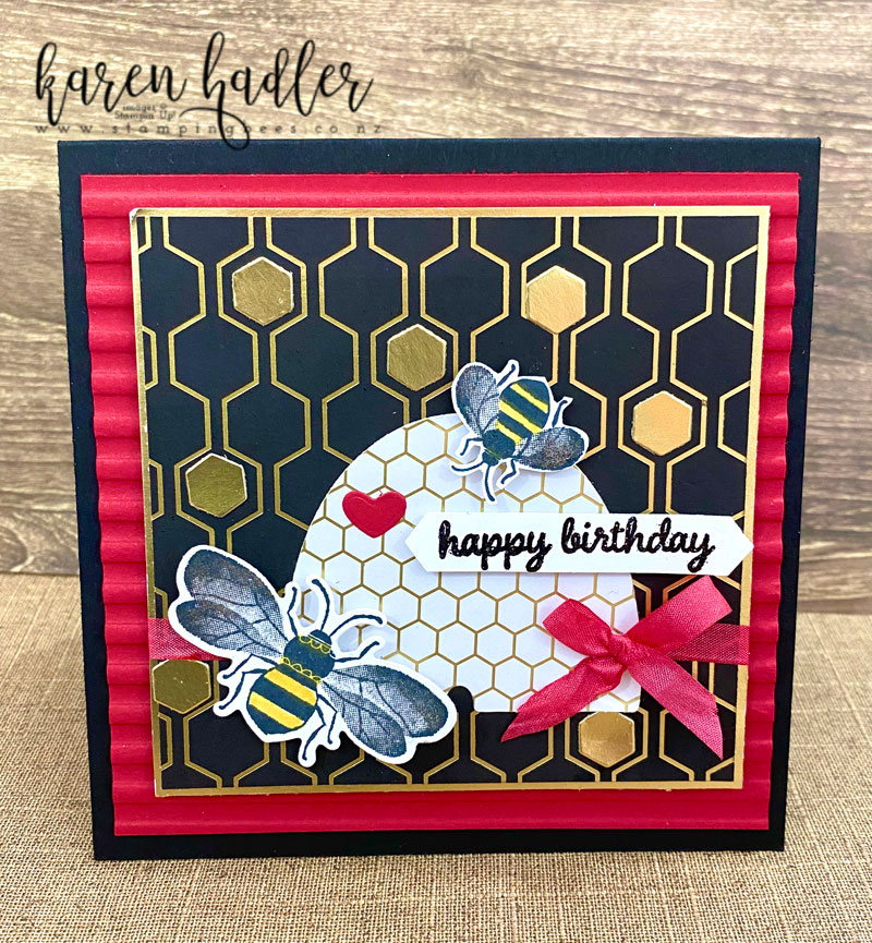I so love this bundle and the Golden Honey Spoecialty Designer Series Paper in Sale-A-Bration really is perfect for this set and many others, as the colours are Black, Gold Foil and White ….very vesatile. I am so happy that it is free when you spend NZD$110.00 or more as I have nearly used my first pack all up! For this example I was inspired by a beautiful Trinket Box I was given for my birthday recently (yes I do love bees) it really did match the papers 🙂 I have made a card and Squishy Bag that I CASED from Pootles.Papercraft, it looks fabulous and is so easy to do! the ribbon on both projects is the Whisper White Crinkled Seam Binding Ribbon from the Peacful Poppies Suite and coloured with Real Red Stampin Belnds.