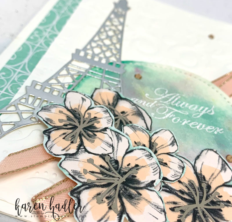 The Eiffel Tower to me signifies, romance and travel , and this suite really does represent this. The colours of Cherry Cobbler, Petal Pink, and Pool party with a touch of Silver Foil combine beautifully to create a real feel of Paris in the Spring. I used our Pigmnt Sprinkles to make a soft background for the Sentiment which I embossed with Shimmer White Powder and the flowers are fussy cut from the stunning Designer Series paper.