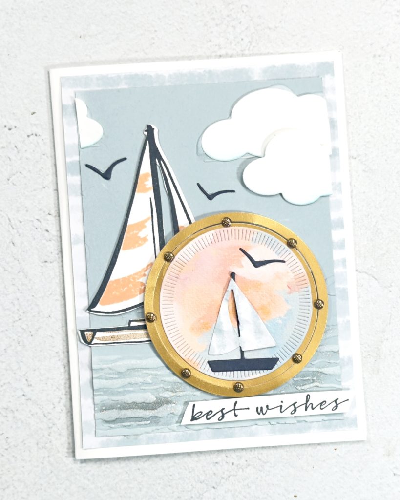Do you find it a little more difficult to create masculine cards? I do, well this bundle really does make it easier. There are more than 1 size of yachts and for trhis card I have tucked the large one behind a “port hole” to add to the nautical theme.