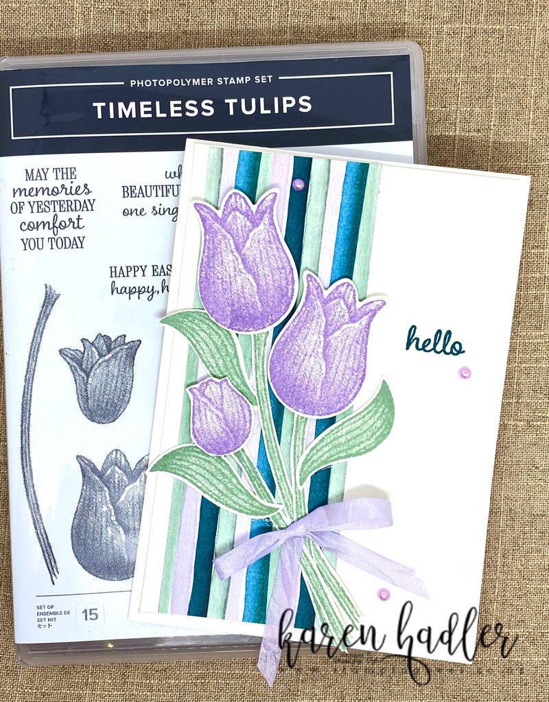 Isn’t this Bundle of Stamp Set and Punch so cute. I love punches they make cutting things out so easy! I have made a beautiful bouquet for this card and have given you some hints on using the punch along the way. The crinkled Seam Binding Ribbon is a must it comes Whisper White but can be coloured to suit your project.